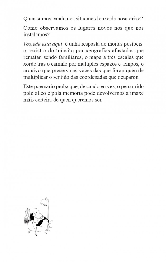 Vostede está aquí é unha resposta de moitas posíbeis: o rexistro do tránsito por xeografías afastadas que rematan sendo familiares, o mapa a tres escalas que xorde tras o camiño por múltiples espazos e tempos, o arquivo que preserva as voces das que foron quen de multiplicar o sentido das coordenadas que ocuparon.